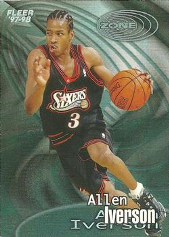 The Allen Iverson 1997 Fleer #9Z Zone card is 1 of 14 Allen Iverson's card variations in the 1997 Fleer set being tracked by Sports Card Investor, including #3 Base, #300 Base, #3 Crystal, #300 Crystal, and #300 Tiffany.