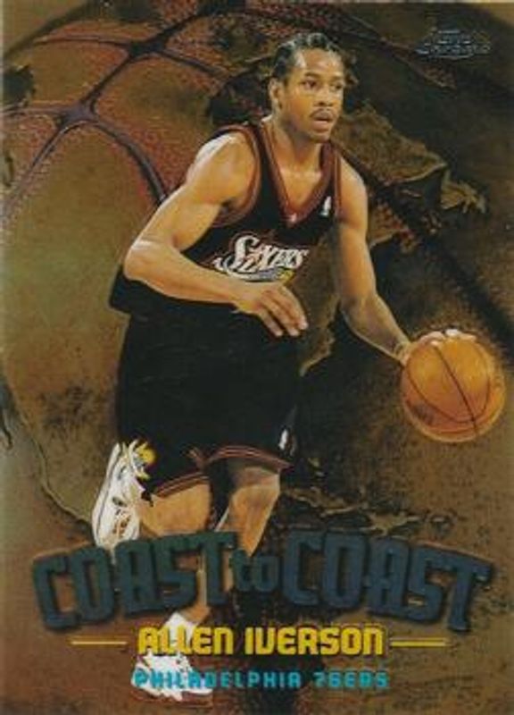 The Allen Iverson 1998 Topps Chrome #CC9 Coast to Coast card is 1 of 4 Allen Iverson's card variations in the 1998 Topps Chrome set being tracked by Sports Card Investor, including Base, Refractor, and Coast to Coast - Refractor.