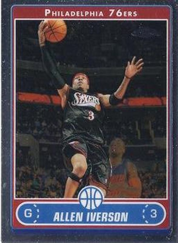 The Allen Iverson 2006 Topps Chrome #108 Base card is 1 of 14 Allen Iverson's card variations in the 2006 Topps Chrome set being tracked by Sports Card Investor, including Framed Press Plates Black /1, Framed Press Plates Cyan /1, Framed Press Plates Magenta /1, Framed Press Plates Yellow /1, and Autographs - Black Refractor.