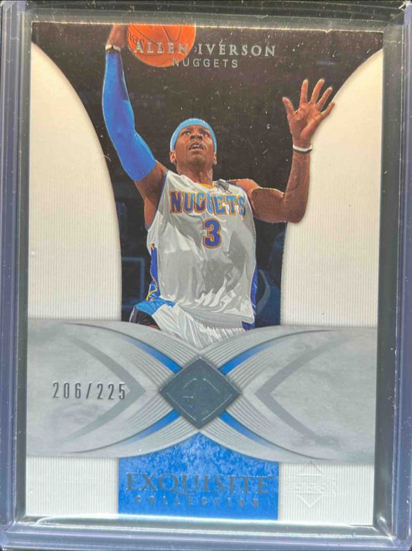 The Allen Iverson 2006 Upper Deck Exquisite Collection #10 Base /225 card is 1 of 13 Allen Iverson's card variations in the 2006 Upper Deck Exquisite Collection set being tracked by Sports Card Investor, including Gold /25, Black Rainbow /1, Masterpiece Printing Plates Black /1, Masterpiece Printing Plates Cyan /1, and Masterpiece Printing Plates Magenta /1.