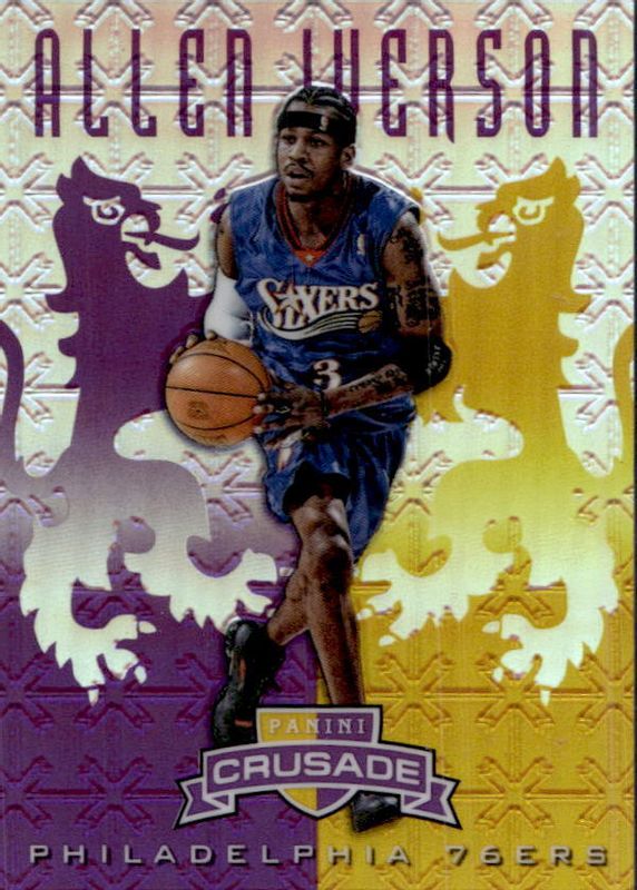 This card is 1 of 6 Allen Iverson's card variations in the 2012 Crusade set being tracked by Sports Card Investor, including Prizm Blue & Gold, Prizm Red & Gold /99, Prizm Green & Gold /25, Prizm Gold /10, and Prizm Black /1.