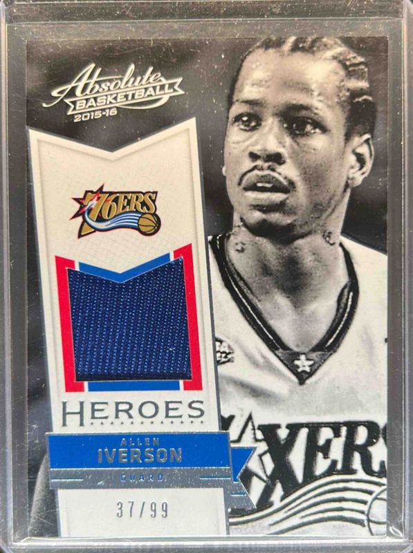 The Allen Iverson 2015 Absolute #8 Heroes - Materials /99 card is 1 of 6 Allen Iverson's card variations in the 2015 Absolute set being tracked by Sports Card Investor, including Base /999, Spectrum Gold /999, Spectrum Black /1, Glass /(SSP), and Heroes Materials - Prime /25.