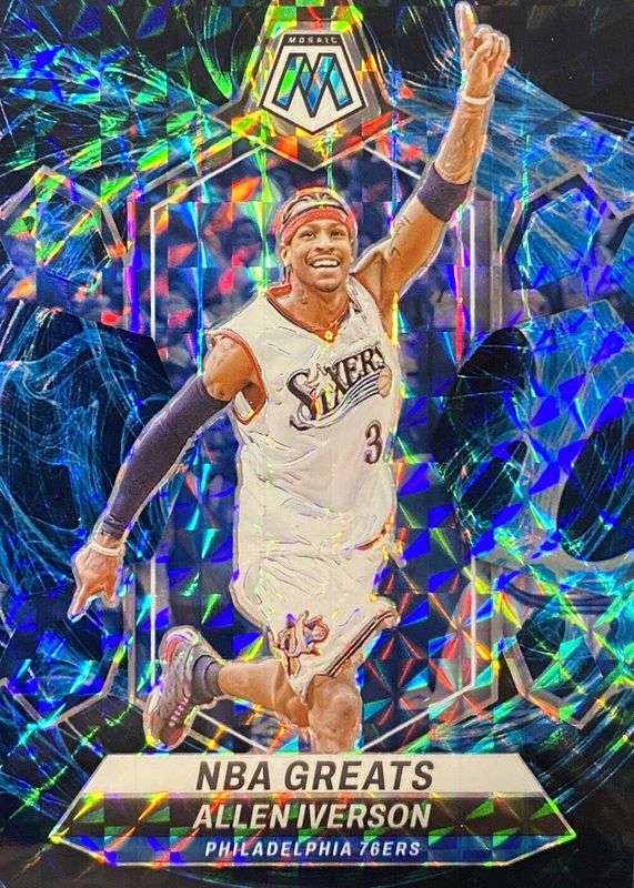 This card is 1 of 23 Allen Iverson's card variations in the 2023 Mosaic set being tracked by Sports Card Investor, including NBA Greats - Choice Peacock /(SSP), NBA Greats - Fast Break Purple /50, NBA Greats - Glitter /(SSP), NBA Greats - White Sparkle /(SSP), and NBA Greats - International Blue /25.