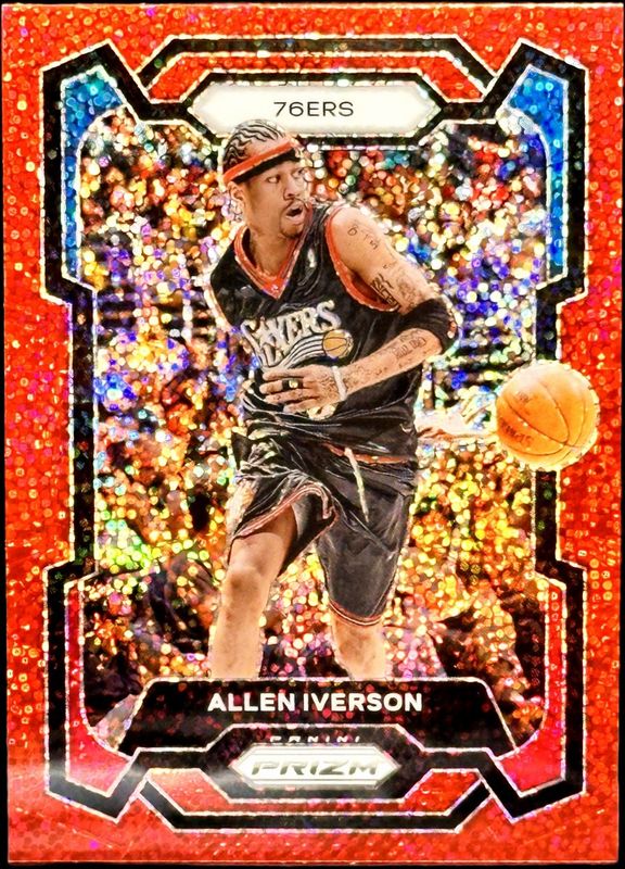 The Allen Iverson 2023 Prizm #184 Red Sparkle /(SSP) card is 1 of 75 Allen Iverson's card variations in the 2023 Prizm set being tracked by Sports Card Investor, including Base, Blue Wave, Choice Blue Yellow Green, Fast Break, and Green.
