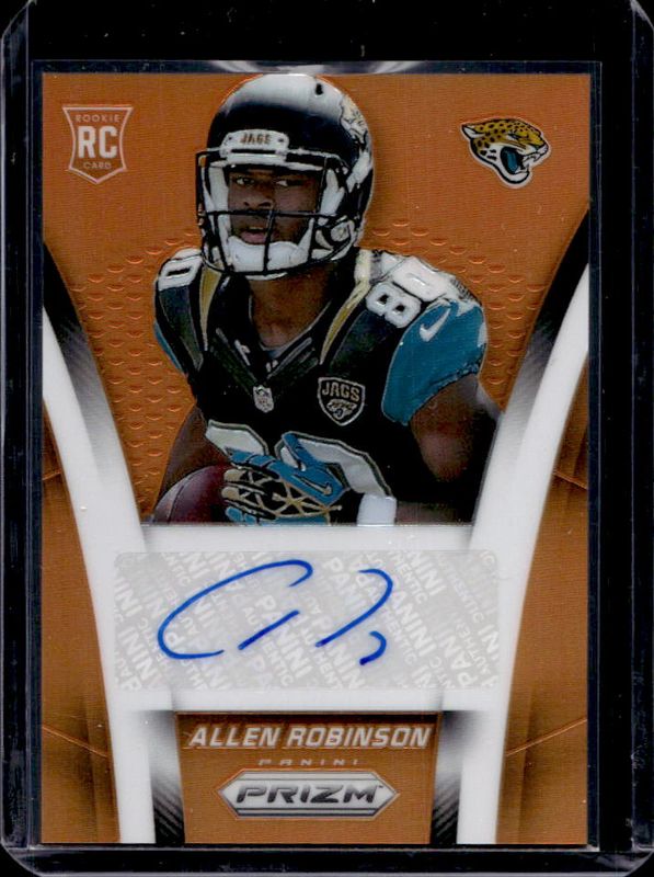 The Allen Robinson II 2014 Prizm #AR-AR Autographed Rookies - Orange /100 card is 1 of 42 Allen Robinson II's card variations in the 2014 Prizm set being tracked by Sports Card Investor, including Base, Blue, Camo, Green, and Neon Green & Yellow.