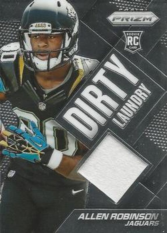 The Allen Robinson II 2014 Prizm #DL-AR Dirty Laundry Rookie card is 1 of 42 Allen Robinson II's card variations in the 2014 Prizm set being tracked by Sports Card Investor, including Base, Blue, Camo, Green, and Neon Green & Yellow.
