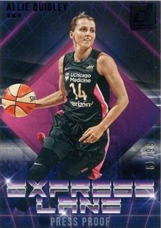 The Allie Quigley 2019 Donruss WNBA #13 Express Lane - Purple Press Proof /99 card is 1 of 29 Allie Quigley's card variations in the 2019 Donruss WNBA set being tracked by Sports Card Investor, including Base, Optic, Optic Holo, Silver Press Proof /199, and Purple Press Proof /99.