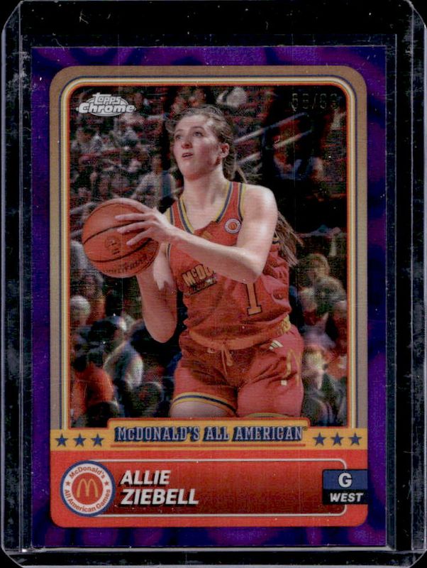 The Allie Ziebell 2024 Topps Chrome McDonald's All-American #24 Purple Lava Refractor /99 card is 1 of 112 Allie Ziebell's card variations in the 2024 Topps Chrome McDonald's All-American set being tracked by Sports Card Investor, including #74 Base, #24 Base, #24 Blue RayWave Refractor, #74 Blue RayWave Refractor, and #24 McDonald's Logo Refractor.