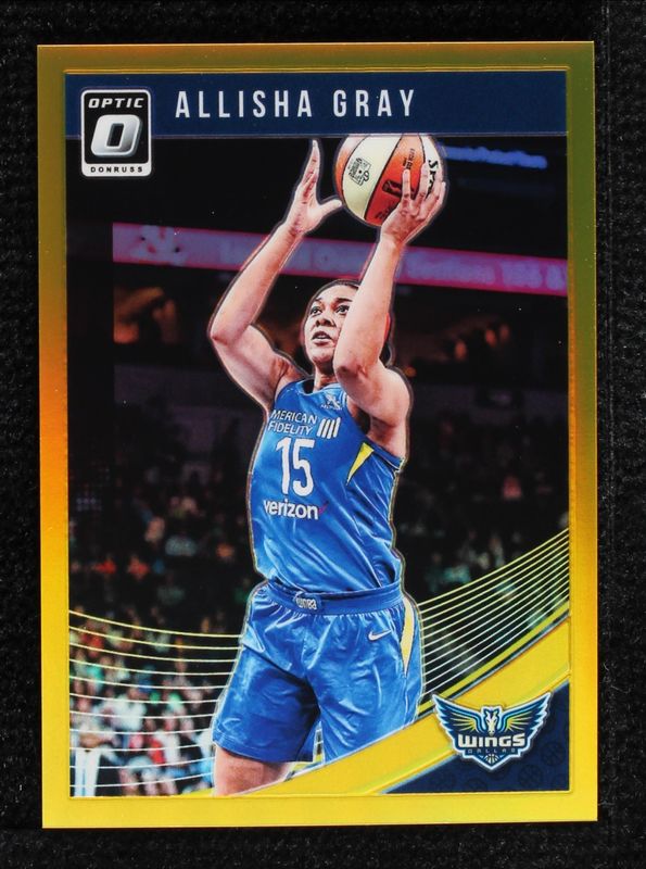 The Allisha Gray 2019 Donruss WNBA #26 Optic Gold /10 card is 1 of 9 Allisha Gray's card variations in the 2019 Donruss WNBA set being tracked by Sports Card Investor, including Base, Optic, Optic Holo, Silver Press Proof /199, and Purple Press Proof /99.