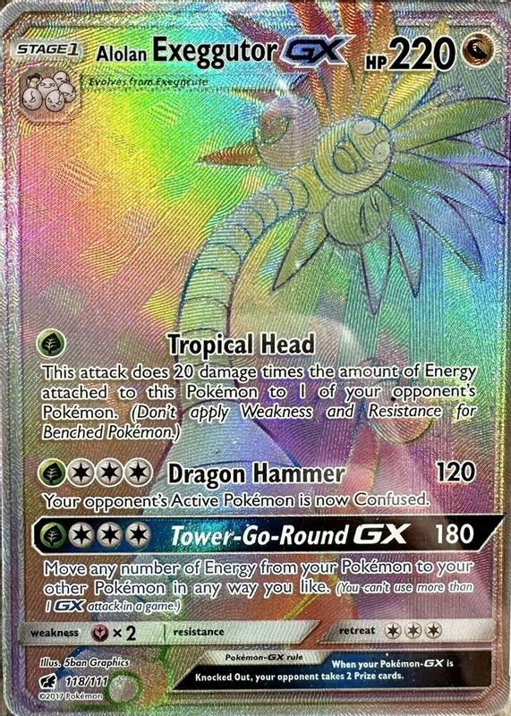 The Alolan Exeggutor GX 2017 Sun & Moon: Crimson Invasion #118/111 Holo (Secret) card in Raw TCG (Near Mint) condition has moved up $3.00 (+37.5%) in the last 30 days and was last sold for $11.00 .