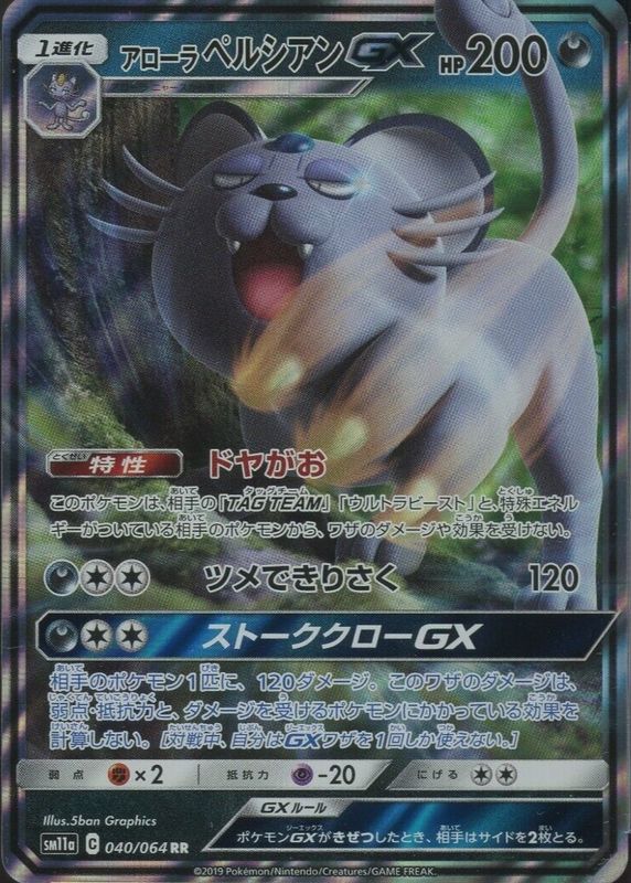 The Alolan Persian GX 2019 Japanese Sun & Moon: Remix Bout #040/064 Double Rare card in Raw TCG (Near Mint) condition has moved down -$0.41 (-20.5%) in the last 30 days and was last sold for $1.59 .