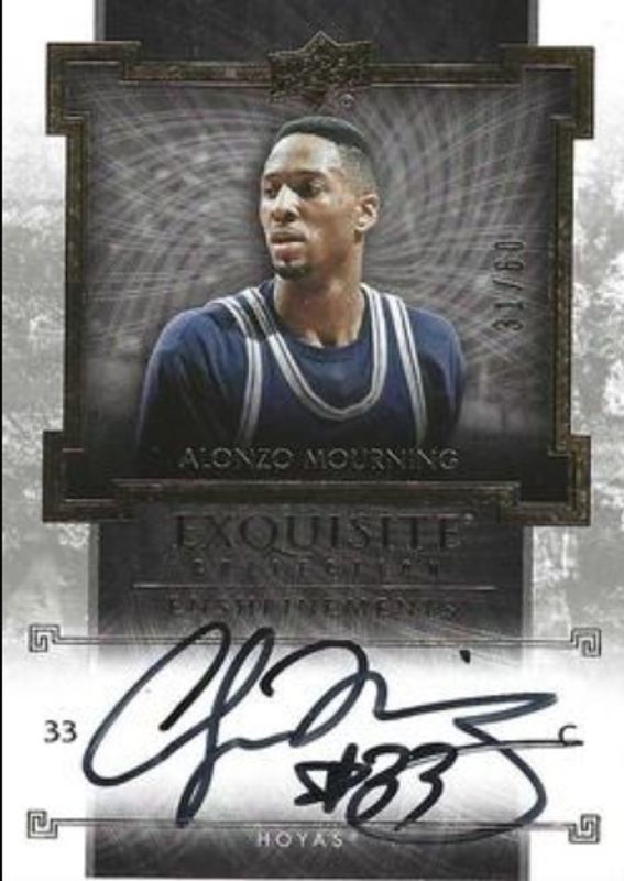 The Alonzo Mourning 2013 Upper Deck Exquisite Collection #EE-AM Enshrinements /60 card is 1 of 17 Alonzo Mourning's card variations in the 2013 Upper Deck Exquisite Collection set being tracked by Sports Card Investor, including Base /75, Signatures Black, Silver Spectrum /10, Signatures Red /7, and Signatures Orange /6.