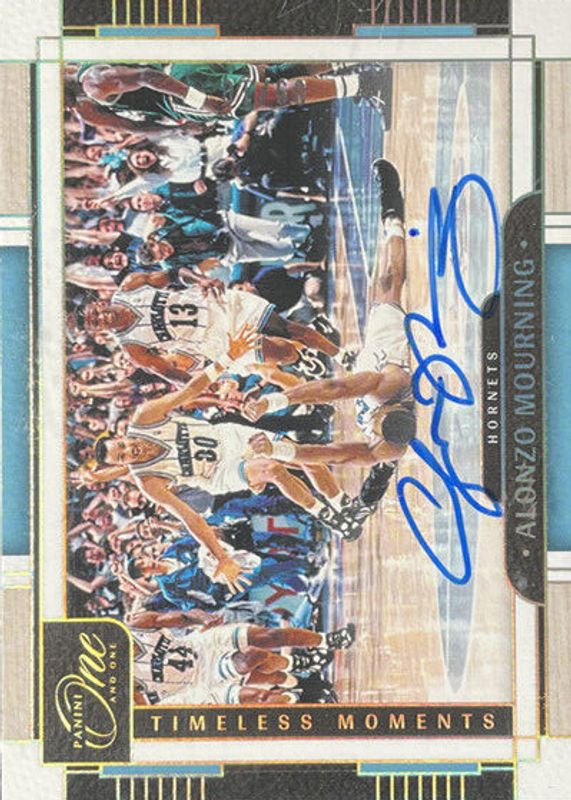 The Alonzo Mourning 2023 One and One #TMA-AZM Timeless Moments Autographs - Gold /10 card in Raw condition has not changed in price in the last 30 days and was last sold for $411.18 .