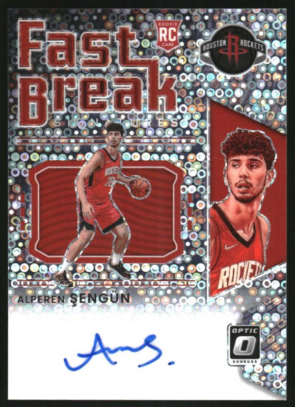 The Alperen Sengun 2021 Optic #FB-ASP Fast Break Signatures Rookie card is 1 of 82 Alperen Sengun's card variations in the 2021 Optic set being tracked by Sports Card Investor, including Base, Blue Pulsar, Blue Velocity, Checkerboard, and Choice.