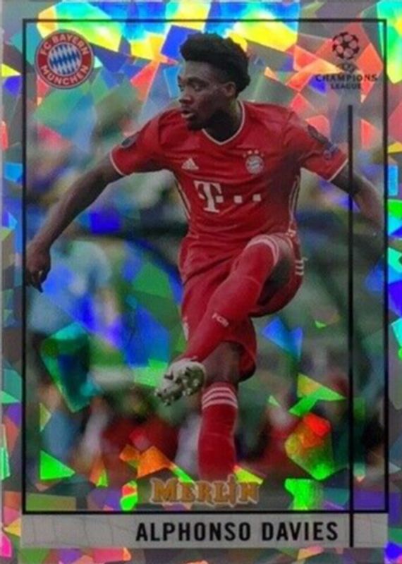 This card is 1 of 18 Alphonso Davies' card variations in the 2020 Topps Merlin Chrome UEFA Champions League set being tracked by Sports Card Investor, including Aqua Prism Refractor, Refractor, Purple Refractor /299, Aqua Refractor /199, and Speckle Refractor /150.