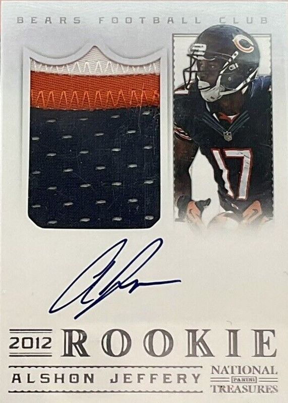 Alshon Jeffery's Football cards are available in at least 38 sets. Alshon Jeffery's biggest 7-day price movers are 2012 National Treasures #335 Rookie Patch Auto /99, 2012 National Treasures #335 Rookie Patch Auto - Black /25, and 2012 Contenders #235 Rookie Ticket Auto (Running).
