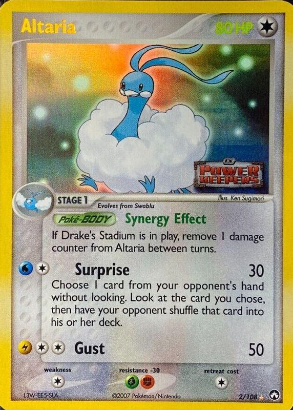 The Altaria 2007 EX: Power Keepers #002/108 Reverse Holo card in Raw TCG (Near Mint) condition has not changed in price in the last 30 days and was last sold for $18.00 .