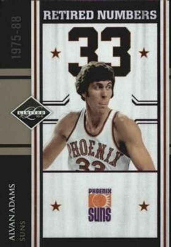 The Alvan Adams 2010 Limited #20 Retired Numbers /149 card is 1 of 17 Alvan Adams' card variations in the 2010 Limited set being tracked by Sports Card Investor, including Base /199, Silver Spotlight /149, Gold Spotlight /49, Platinum Spotlight /1, and Retired Numbers - Materials /99.