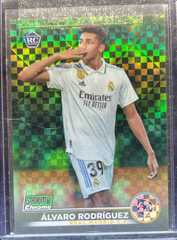 The Alvaro Rodriguez 2022 Topps Stadium Club Chrome UEFA Club Competitions #90 Neon Green X Fractor /175 Rookie card is 1 of 30 Alvaro Rodriguez's card variations in the 2022 Topps Stadium Club Chrome UEFA Club Competitions set being tracked by Sports Card Investor, including Base, Blue Prism Refractor, Pink Red Electric Charge Refractor, Refractor, and Black & White Prism Refractor /350.
