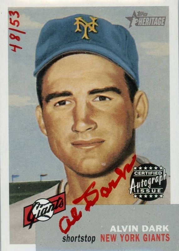 This card is 1 of 4 Alvin Dark's card variations in the 2002 Topps Heritage set being tracked by Sports Card Investor, including Clubhouse Collection, Real One Autographs, and Clubhouse Collection Autographs /25.