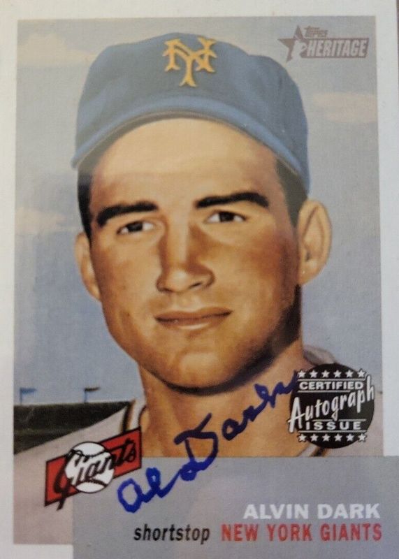 This card is 1 of 4 Alvin Dark's card variations in the 2002 Topps Heritage set being tracked by Sports Card Investor, including Clubhouse Collection, Real One Autographs - Red Ink /53, and Clubhouse Collection Autographs /25.