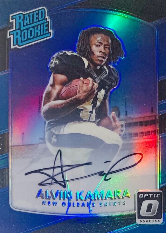 The Alvin Kamara 2017 Optic #199 Rated Rookie Autographs - Black /25 card in Raw condition has not changed in price in the last 30 days and was last sold for $225.50 .