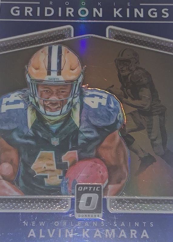 The Alvin Kamara 2017 Optic #11 Rookie Gridiron Kings - Blue /149 card in Raw condition has not changed in price in the last 30 days and was last sold for $5.40 .