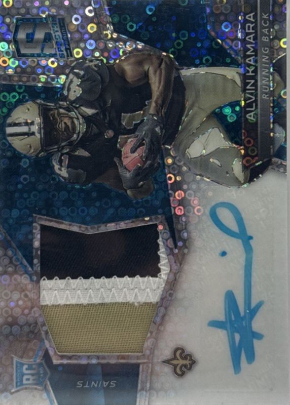 Auctions Ending Soon for Alvin Kamara 2017 Spectra #213 Rookie Patch Auto - Neon Blue /75 BGS 9.5