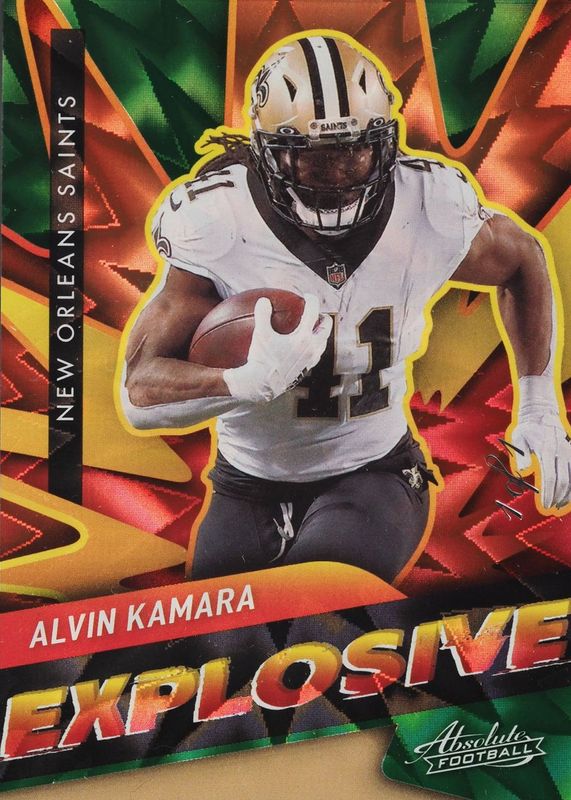 This card is 1 of 3 Alvin Kamara's card variations in the 2021 Absolute set being tracked by Sports Card Investor, including Explosive /(SSP), and Explosive - Gold /10.