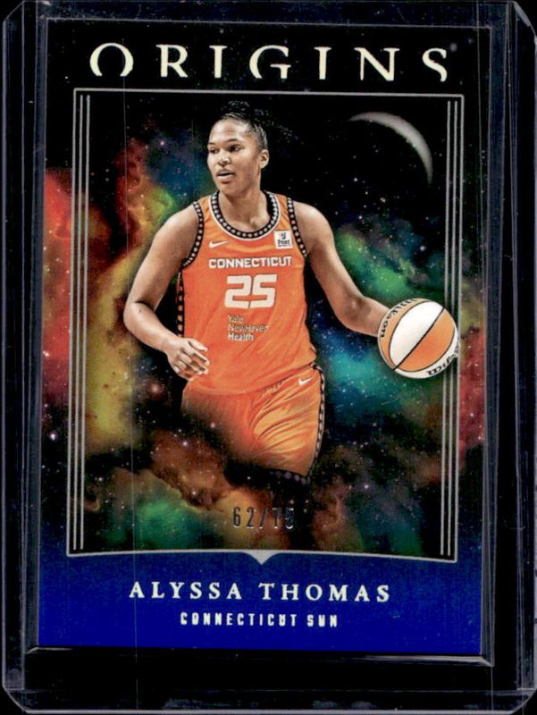 The Alyssa Thomas 2024 Origins WNBA #60 Blue /75 card is 1 of 13 Alyssa Thomas' card variations in the 2024 Origins WNBA set being tracked by Sports Card Investor, including Base, Red /99, Swirl /(SSP), Teal /49, and Purple /25.