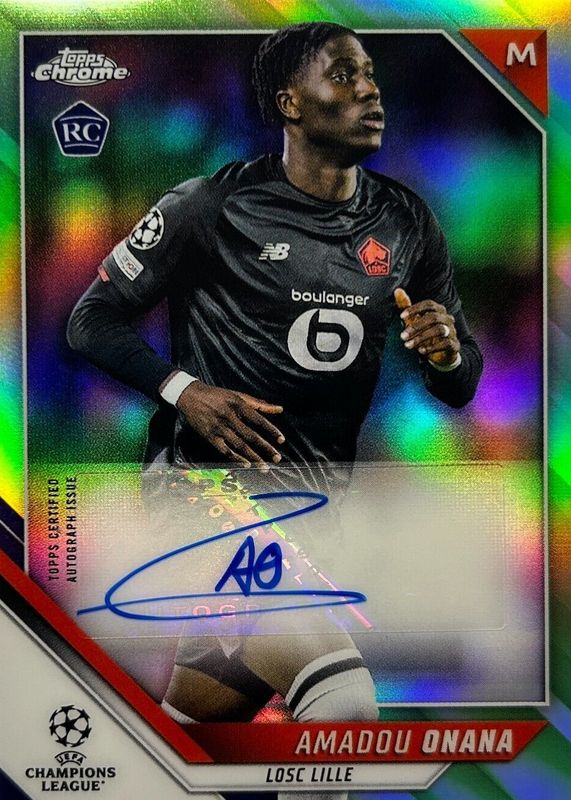 The Amadou Onana 2021 Topps Chrome UEFA Champions League #CA-AO Autographs - Neon Green Refractor /99 Rookie card in Raw condition has not changed in price in the last 30 days and was last sold for $5.50 .