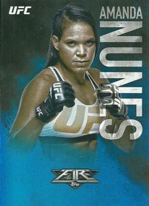 The Amanda Nunes 2017 Topps Fire UFC #41 Blue Flame /25 card is 1 of 7 Amanda Nunes' card variations in the 2017 Topps Fire UFC set being tracked by Sports Card Investor, including Base, Red Hot /142, Inferno /1, Autographs /149, and Autographs - Blue Flame /25.