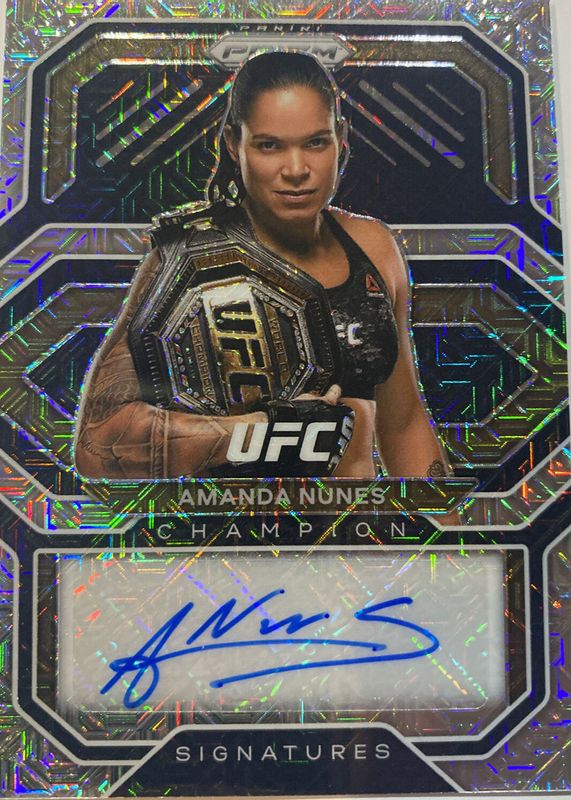 The Amanda Nunes 2021 Prizm UFC #CS-ANS Champion Signatures - Mojo /25 card in Raw condition has not changed in price in the last 30 days and was last sold for $207.50 .