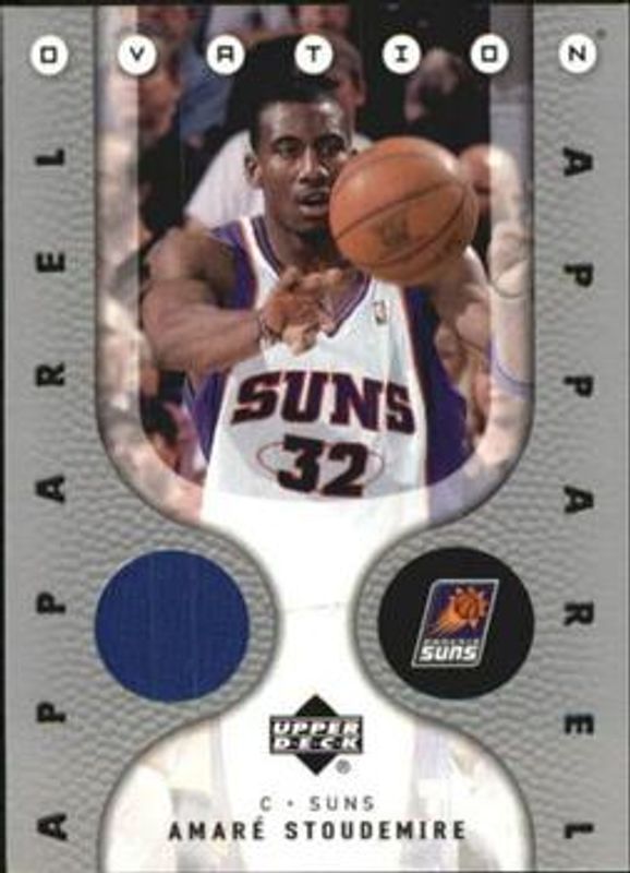 The Amar'e Stoudemire 2006 Upper Deck Ovation #OA-AS Apparel card is 1 of 3 Amar'e Stoudemire's card variations in the 2006 Upper Deck Ovation set being tracked by Sports Card Investor, including Center Stage, and Apparel - Gold /50.
