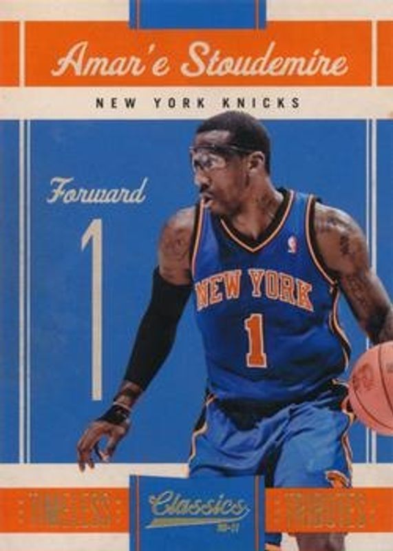 The Amar'e Stoudemire 2010 Classics #54 Timeless Tributes Gold /100 card is 1 of 19 Amar'e Stoudemire's card variations in the 2010 Classics set being tracked by Sports Card Investor, including Base /999, Timeless Tributes Silver /250, Timeless Tributes Platinum /25, Timeless Tributes Black /1, and 2011 Hoops Previews.