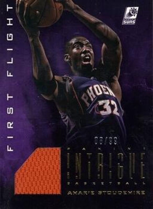 The Amar'e Stoudemire 2012 Intrigue #14 First Flight Unis /49 card is 1 of 9 Amar'e Stoudemire's card variations in the 2012 Intrigue set being tracked by Sports Card Investor, including Base /99, Gold /10, Platinum /1, Top Flight Unis /99, and First Flight Unis - Prime /10.