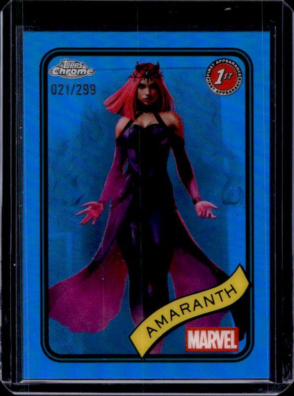 The Amaranth 2025 Topps Chrome #99 Blue Refractor /299 card is 1 of 29 Amaranth's card variations in the 2025 Topps Chrome set being tracked by Sports Card Investor, including Base, Refractor, Yellow Lava Refractor, Spider Web Refractor /399, and Blue & Green Shimmer Refractor /199.