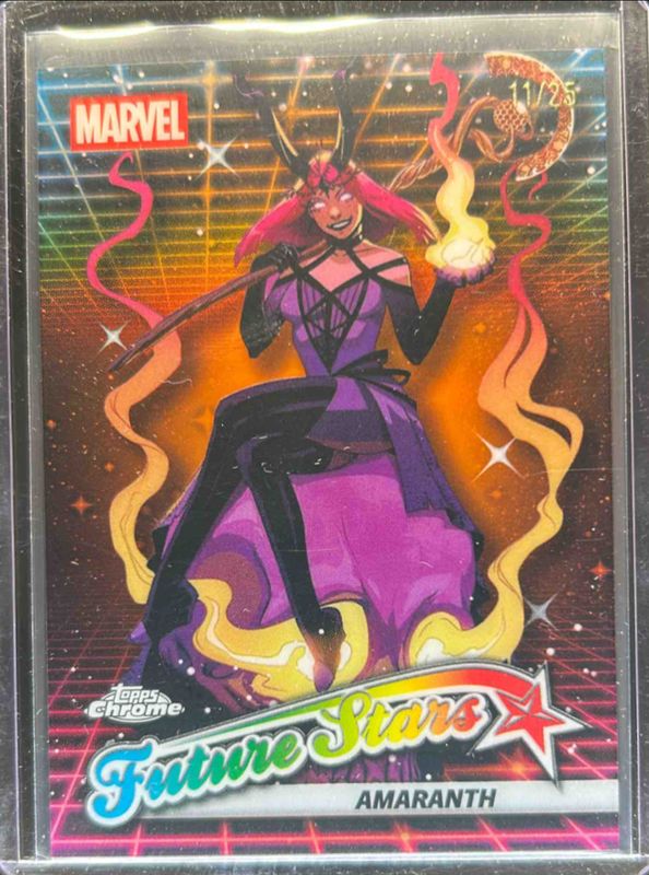 The Amaranth 2025 Topps Chrome #FS-8 Future Stars - Orange Refractor /25 card is 1 of 29 Amaranth's card variations in the 2025 Topps Chrome set being tracked by Sports Card Investor, including Base, Refractor, Yellow Lava Refractor, Spider Web Refractor /399, and Blue Refractor /299.