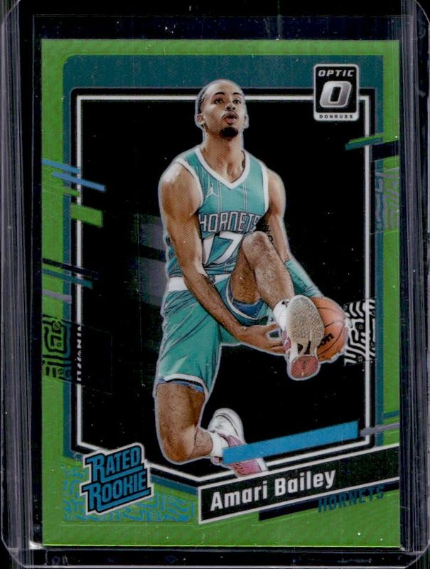 The Amari Bailey 2023 Optic #210 Lime Green /149 Rookie card is 1 of 68 Amari Bailey's card variations in the 2023 Optic set being tracked by Sports Card Investor, including Base, Blue Velocity, Checkerboard, Choice, and Choice Red & Green.