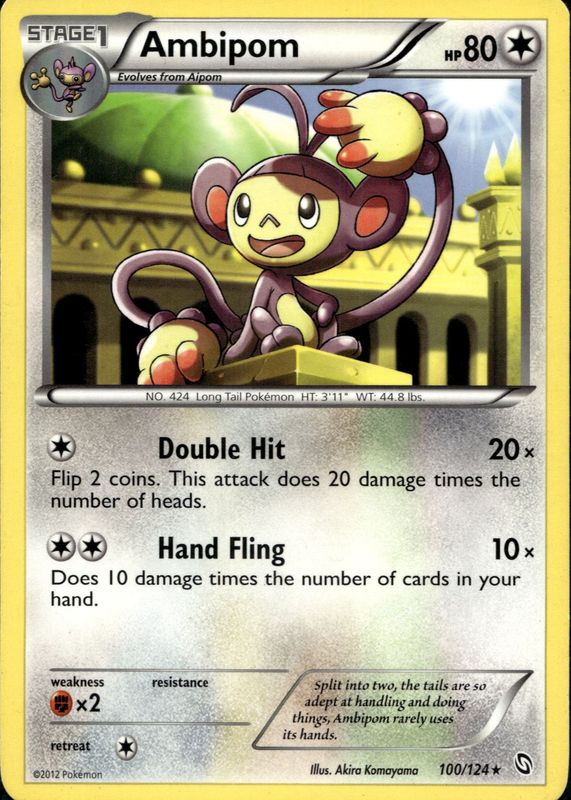 The Ambipom 2012 Black & White: Dragons Exalted #100/124 Base card in Raw TCG (Lightly Played) condition has not changed in price in the last 30 days and was last sold for $1.81 .