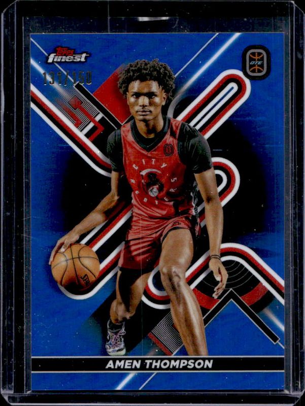 The Amen Thompson 2022 Topps Finest OTE Overtime Elite #4 Blue Refractor /150 card is 1 of 66 Amen Thompson's card variations in the 2022 Topps Finest OTE Overtime Elite set being tracked by Sports Card Investor, including #34 Base, #59 Base, #4 Base, #4 Refractor, and #34 Refractor.