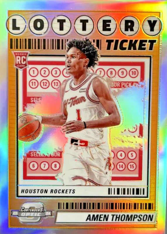 The Amen Thompson 2023 Contenders Optic #11 Lottery Ticket Rookie card in Raw condition has not changed in price in the last 30 days and was last sold for $11.00 .