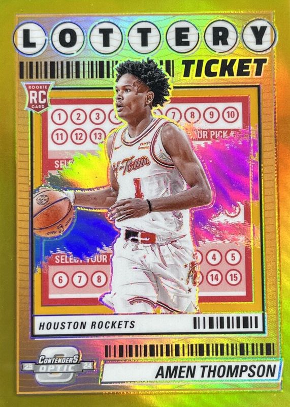 The Amen Thompson 2023 Contenders Optic #11 Lottery Ticket - Gold /10 Rookie card in Raw condition has not changed in price in the last 30 days and was last sold for $200.00 .