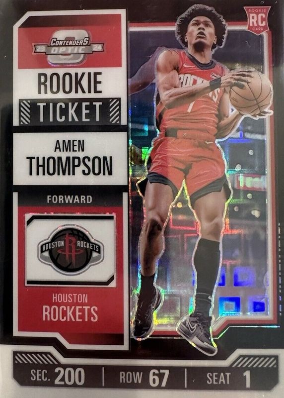 The Amen Thompson 2023 Contenders Optic #8 Rookie Ticket - Black Pandora /(SSP) card in Raw condition has not changed in price in the last 30 days and was last sold for $174.99 .