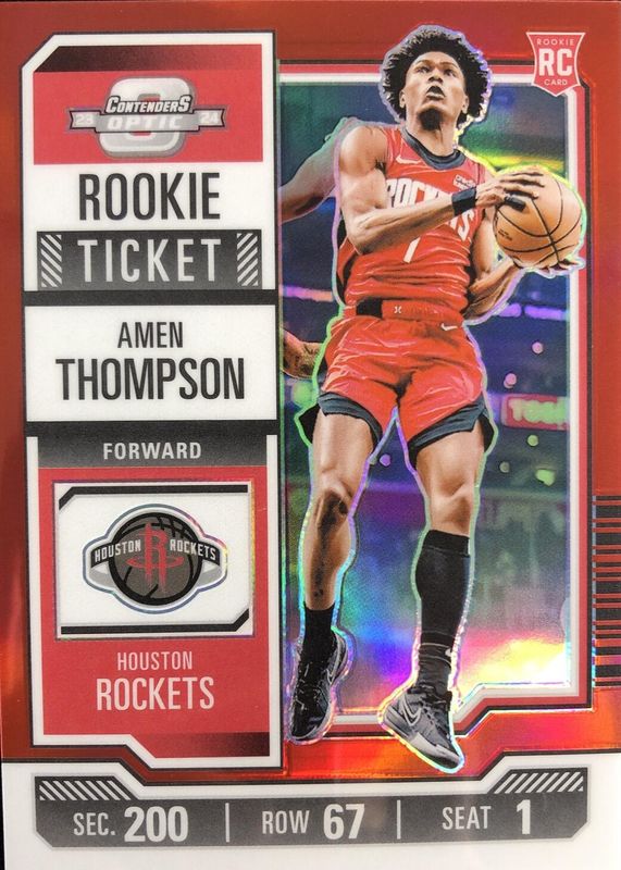 The Amen Thompson 2023 Contenders Optic #8 Rookie Ticket - Red card in Raw condition has moved up $9.50 (+57.6%) in the last 30 days and was last sold for $26.00 .