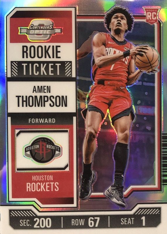 The Amen Thompson 2023 Contenders Optic #8 Rookie Ticket - Silver card in Raw condition has not changed in price in the last 30 days and was last sold for $9.99 .