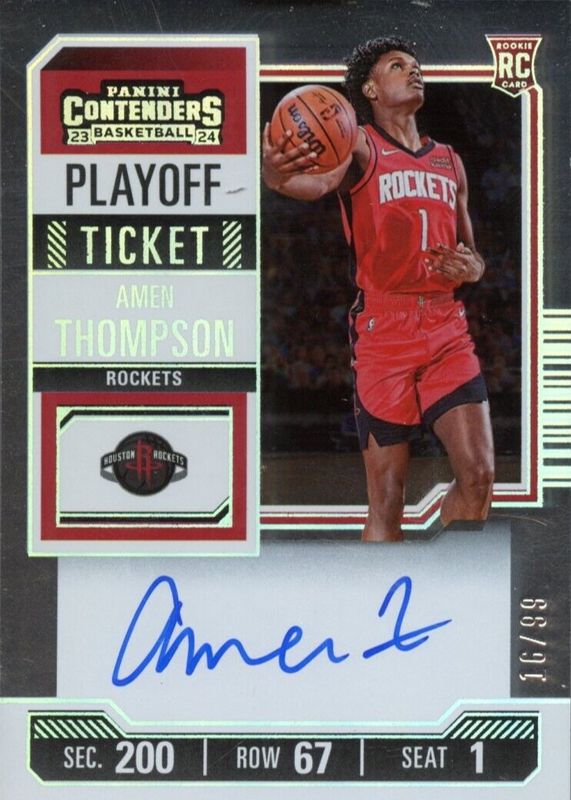 The Amen Thompson 2023 Contenders #111 Rookie Ticket Auto - Playoff Ticket /99 card in Raw condition has moved up $1.00 (+0.3%) in the last 30 days and was last sold for $305.00 .