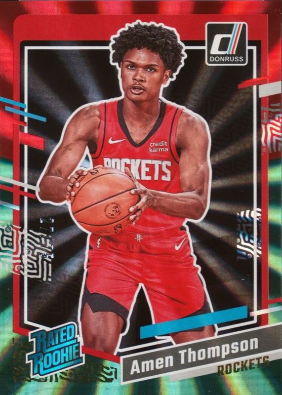 The Amen Thompson 2023 Donruss #206 Holo Red & Green Laser /75 Rookie card in Raw condition has not changed in price in the last 30 days and was last sold for $33.00 .