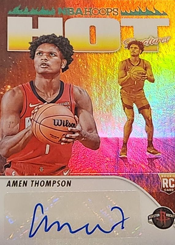 The Amen Thompson 2023 Hoops #HSR-AH Hot Signatures Rookies - Green card in Raw condition has not changed in price in the last 30 days and was last sold for $70.00 .