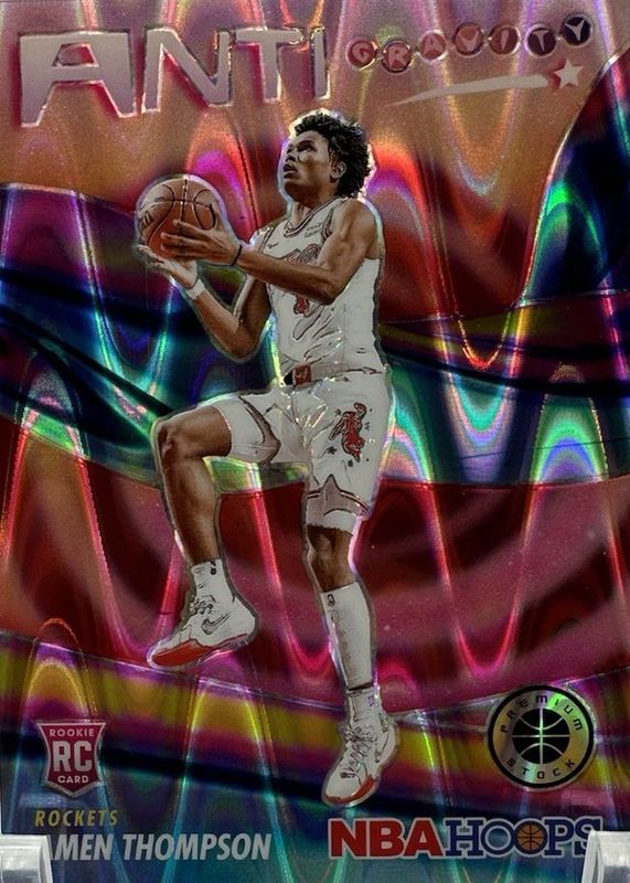 The Amen Thompson 2023 Hoops Premium Stock #16 Anti Gravity - Red Seismic /199 Rookie card in Raw condition has not changed in price in the last 30 days and was last sold for $7.00 .
